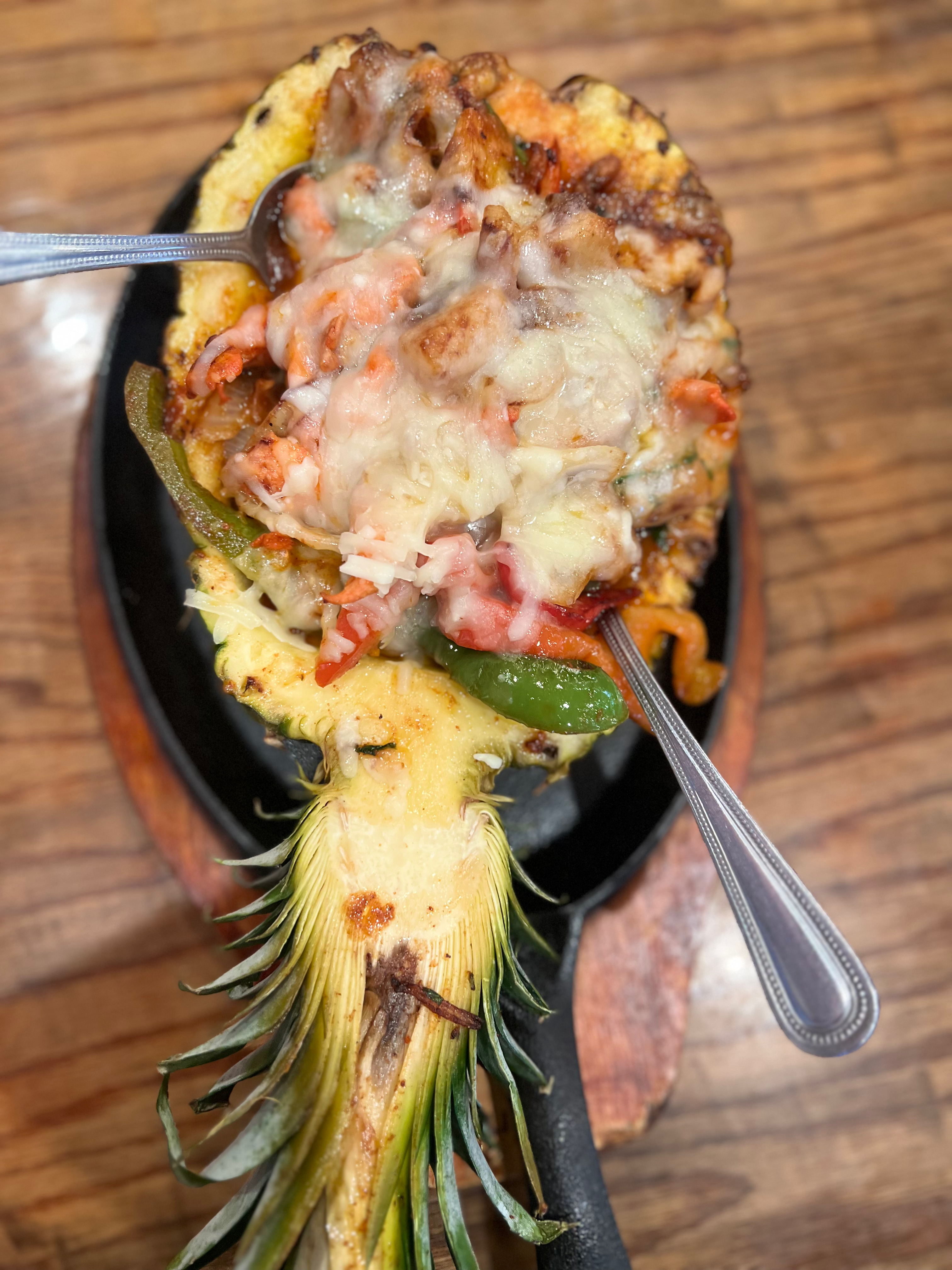 Grilled shrimp and caramelized veggies tossed with pineapple and topped with melted Oaxaca cheese, served hot in a fresh half pineapple.